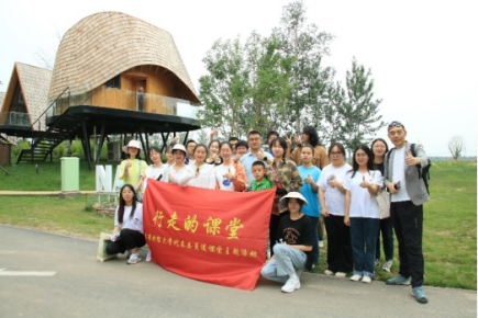 在教学现场,梁强教授从理想村村前种植的小麦引入,向同学们介绍了树蛙部落理想村的由来。树蛙部落理想村,原本是天津市林业和草原局的林果良种场,为了保留乡村原有的韵味,理想村的园区设计最大程度地保留了原有的植被和建筑。随后,梁强教授与理想村的运营负责人杨总一起带领同学们参观了树蛙部落民宿的经典建筑——三角屋、荷叶屋、鸟巢屋。这些民宿均大量采用木色与木质结构,深刻体现了设计者融入乡村的设计理想。
