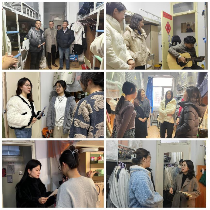 党委书记刘玉斌、院长张建宇、党委副书记严晓芳、纪委书记孙欣与辅导员老师们深入学生宿舍,与同学们亲切交流寒假生活、返校后感受、新学期的目标规划以及需要帮助解决的问题等,嘱咐同学们新学期调整好心态,追求更高的目标和价值,以实现自我超越和成长。