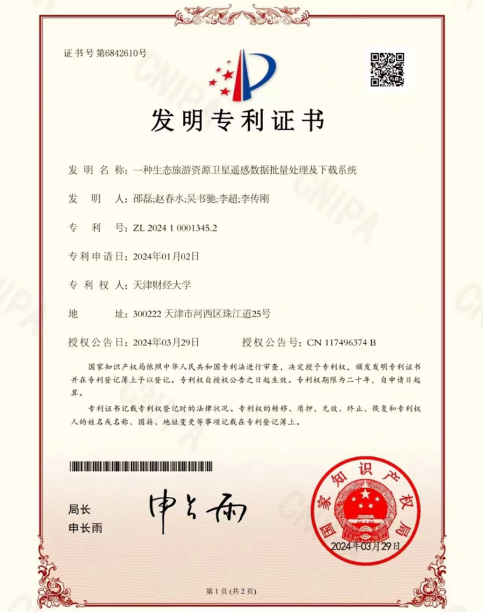 旅游系教师邵磊博士的发明专利“一种生态旅游资源卫星遥感数据批量处理及下载系统”获得审批,该专利为生态旅游资源管理提供了创新性技术解决方案。