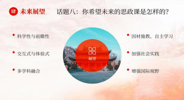 思政教学改革的有益探索。科学性与前瞻性、因材施教、交互式与体验式、强化社会实践、多学科融合以及增强国际视野,成为了思政课未来发展的关键词。为了实现这些目标,同学们也提出了一系列切实可行的建议。利用大数据和人工智能技术分析学生学习习惯,能够为学生提供个性化的学习路径和资源,满足不同学生的学习需求;运用虚拟现实技术,打造沉浸式学习体验,让学生仿佛置身于历史与现实的场景之中,增强学习的趣味性和实效性; 组织社会服务活动,让学生在实践中践行思政理念,培养社会责任感;多学科融合则打破学科界限,为思政课注入新的活力;增强国际视野,使思政教育与时俱进,助力学生们发展成长为具有全球眼光的新时代人才。