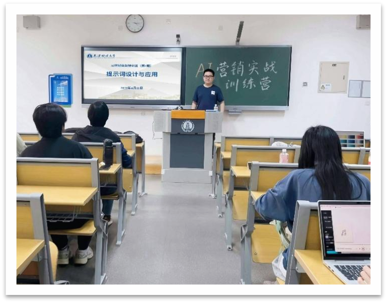 2025年4月11日,首期课程「提示词技术与AI创造力激活」由营销2302周涛同学担任主讲,吸引了本系师生代表全程参与。通过3小时高强度实训,学员不仅掌握了AI工具的操作逻辑,更完成了从“模糊指令”到”控制”的思维升级。