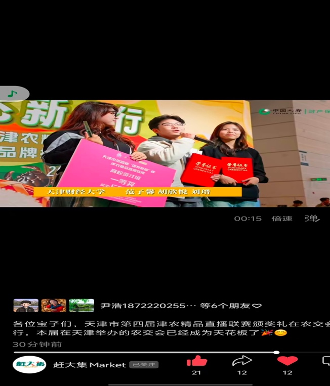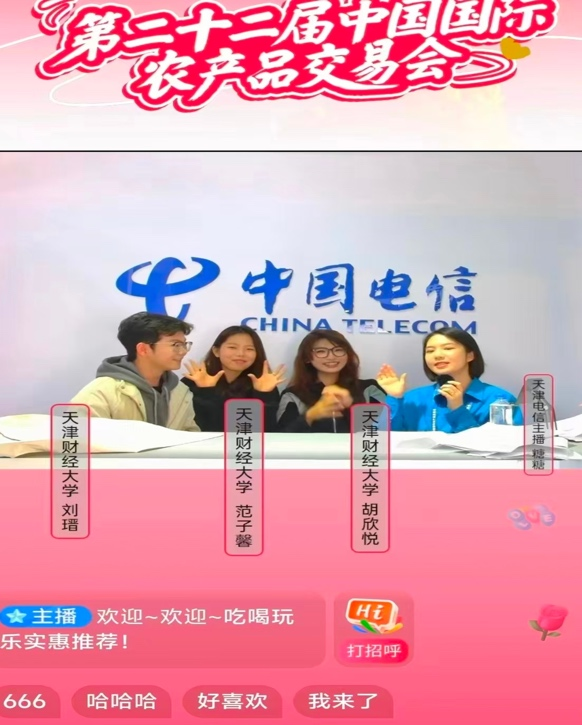 10月17日至19日,第22届中国国际农产品交易会在国家会展中心举办。团队成员在此时间登上领奖台,接受采访。同时,他们也受邀走进了中国电信直播间,为津农精品、家乡好产品做宣传,再次展现了大学生积极向上、睿智幽默的风貌。