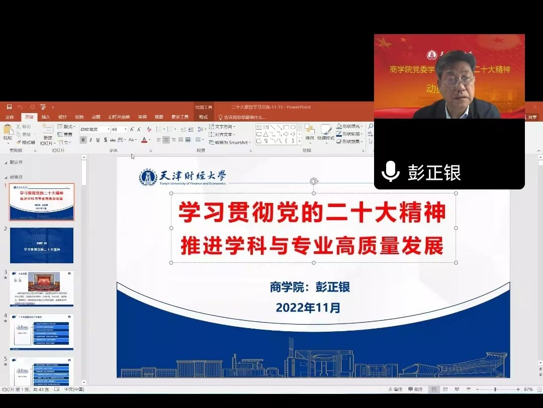 党委书记彭正银作了主题为“学习贯彻党的二十大精神推进学科与专业高质量发展”专题讲座。专题讲座分“学习贯彻党的二十大精神”、“提升人才培养质量的主要任务”、“推动一流专业建设的主要工作”、“围绕高质量发展的研究方向”等四部分。彭正银书记围绕党的二十大报告十五个部分、过去五年的工作和新时代十年的伟大变革、开辟马克思主义中国化时代化新境界、不断谱写马克思主义中国化时代化篇章是当代中国共产党人的庄严历史责任、实施科教兴国战略强化现代化建设人才支撑等方面,对党的二十大精神进行了较深入地阐释。在此基础上,紧扣高质量发展是全面建设社会主义现代化国家的首要任务,从专业建设、课程建设、师资队伍与学生培养四方面解析提升人才培养质量的主要任务,就探索“新商科”人才培养模式、全面进行教学改革以推动一流专业建设的主要工作进行了阐述。