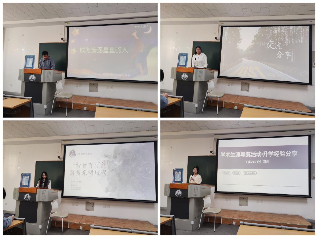 2023年度学生科研先进个人标兵、工实2101班的刘光栋同学基于自身的科研实践,细致入微地分享了科研和竞赛选题的独特视角、高效工具以及实用技巧,为同学们的科研和竞赛活动提供了极具价值的参考;工实2201班的郝硕同学以其参与的2024年全国高校商业精英挑战赛创新创业竞赛创业计划赛道全国总决赛二等奖的作品为切入点,详细阐述了项目申报初期挖掘潜在价值点、组建合适团队的方法等,为同学们的竞赛之路提供了宝贵的参考经验;工实2101班的李飞霞同学从“保研边缘人”的视角,细致分享了备战保研过程中的实用策略,同时传递出一种积极向上、永不言败的精神风貌,激励同学们面对困难时要保持坚韧不拔、自信乐观的风姿风貌;工实2101班的闫鑫同学则从推免保研的全过程入手,为同学们分享了各阶段的重点任务与应对策略,以及课外自主学习、高效获取信息的工具与技巧,为同学们在追求学术卓越与个人发展的道路上提供了有益的启示。