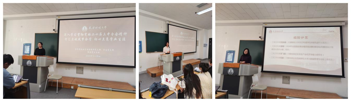 为深入学习贯彻党的二十届三中全会精神,11月29日下午企业管理系教工党支部与学生党支部举行了以“智汇启航筑梦企管 初心点亮学业生涯”为主题的联合党日活动,基于对大学生创新创业精神的培养,邀请了工实2101班的刘光栋、李飞霞、闫鑫和工实2201班的郝硕四位同学,围绕科研、竞赛和升学等同学们关心的问题,为企业管理系22级、23级和工商大类24级的同学们带来了一场别开生面的经验分享和交流活动。
