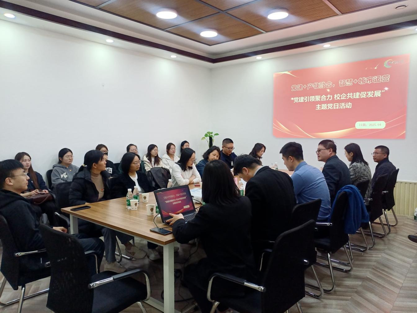 参观过后,老师和同学们又来到了津保环投位于河东区的项目部,双方就党建引领业务发展进行了更为深入的交流。津保环投总经理、机关党支部书记赵永涛首先围绕提升城市现代化建设水平进行了党的二十届三中全会精神宣讲,而后双方分享了各自在争创先进基层党组织过程中的先进经验。随后,双方围绕智慧赋能城市运营这一主题,就未来城市公园的运营、数智技术的赋能以及新应用场景的开发等方向展开了交流。未来,双方将以产教融合研究生工作站为依托,通过设立研究生课题攻关项目,在不断深化产教融合实践的同时,培育兼具数智能力与产业思维的高层次人才,为智慧城市可持续发展提供智力支撑。