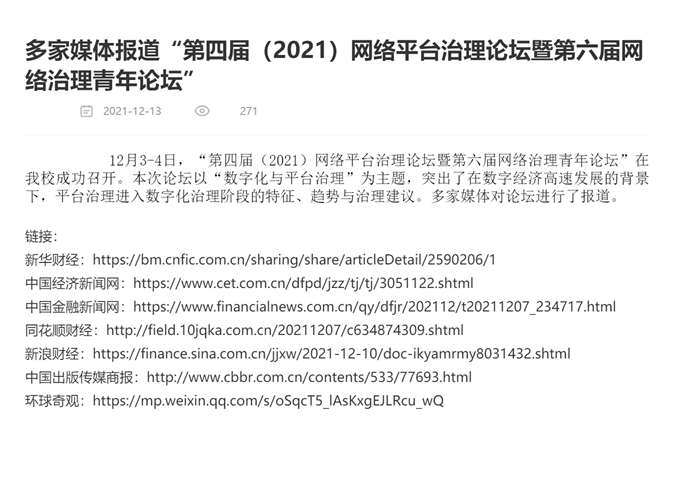 4.承办第四届(2021)网络平台治理论坛暨第六届网络治理青年论坛,并发布《中国数字平台治理研究报告(2021)》,多家媒体对此次论坛进行了报道;