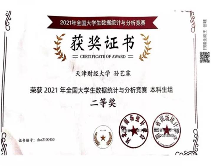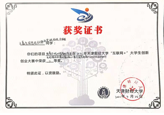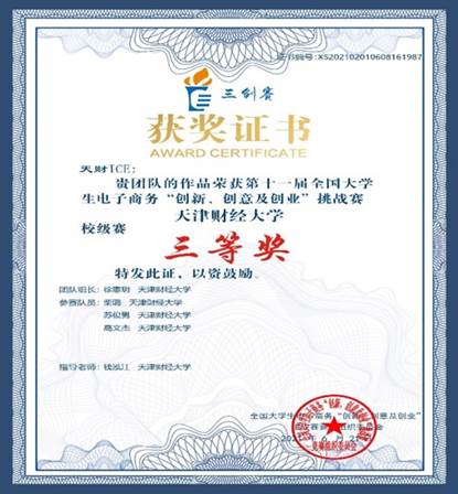 1.全国大学生电子商务“创新、创意及创业”挑战赛三等奖;