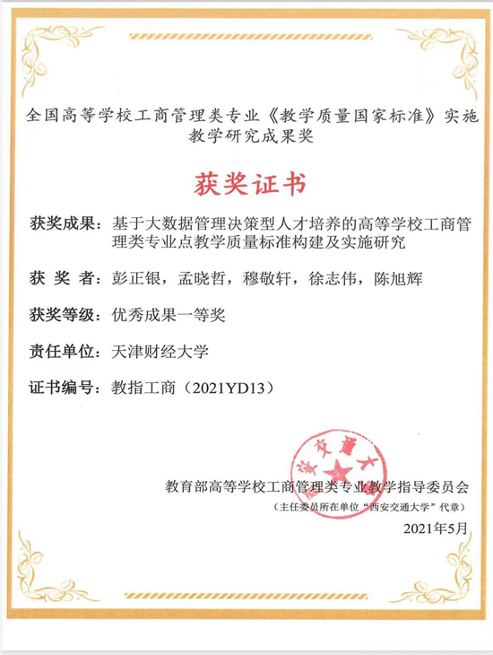 一、基于大数据管理决策型人才培养的高等学校工商管 理类专业点教学质量标准构建及实施研究,优秀成果一等奖;