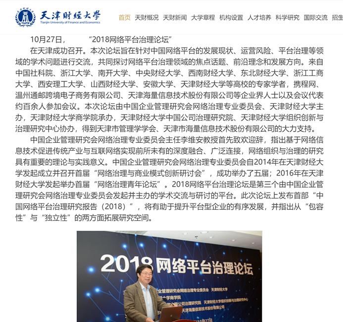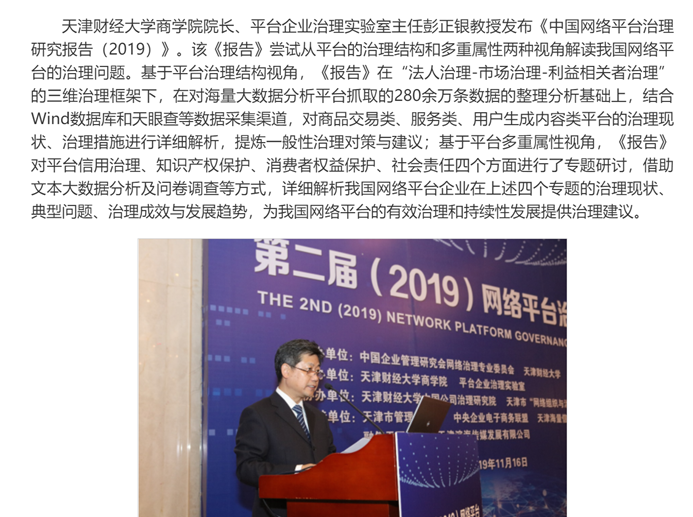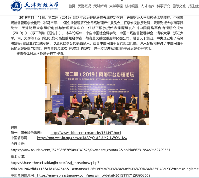 6.承办第二届(2019)网络平台治理论坛并发布《中国网络平台治理研究报告(2019)》,多家媒体对此次论坛进行了报道;