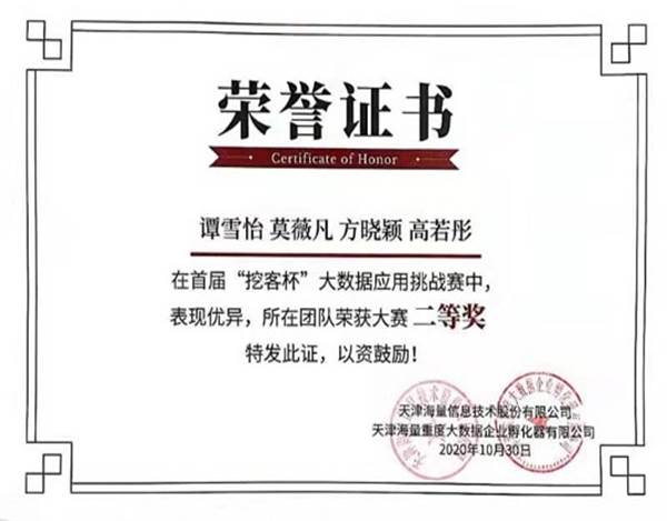 5.“挖客杯”大数据应用挑战赛二等奖(2020年);