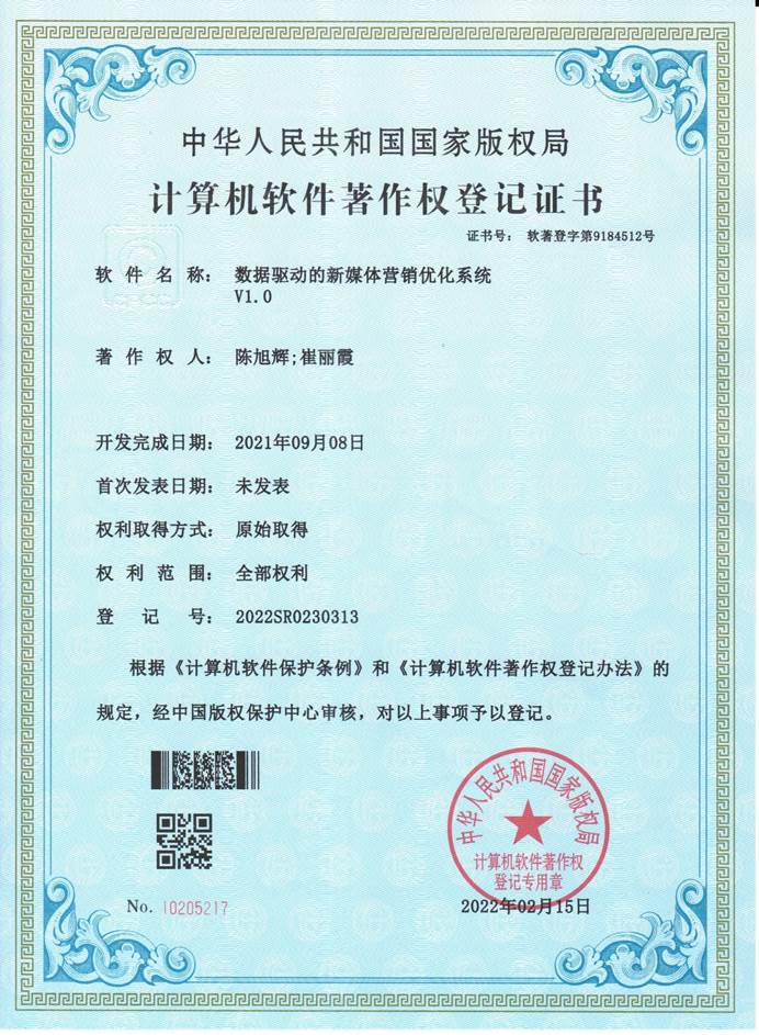 9.数据驱动的新媒体营销优化系统V1.0,国家版权局;
