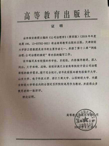5.普通高等教育国家规划教材(参编)《公司治理学》。