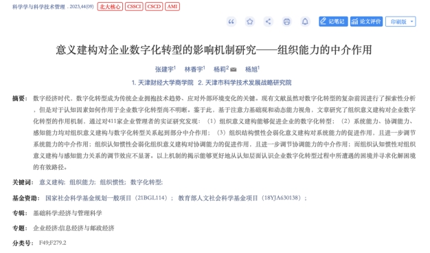 企业管理系张建宇教授与博士生林香宇同学在中文高水平期刊《科学学与科学技术管理》合作发表题为“意义建构对企业数字化转型的影响机制研究——组织能力的中介作用”的论文,日本AV女优