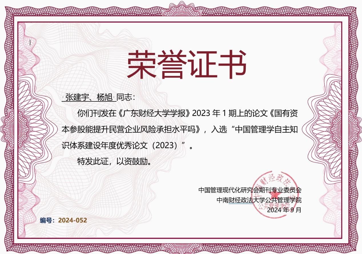 企业管理系张建宇教授及其博士生杨旭合作发表在《广东财经大学学报》2023年1期上的论文《国有资本参股能提升民营企业风险承担水平吗》荣获中国管理现代化研究会期刊工作委员会颁发的“中国管理学自主知识体系建设优秀论文(2023)”。为丰富和搭建期刊与作者之间交流互动环节,共同推动管理学自主知识体系建设,由中国管理现代化研究会期刊工作委员会主办,中南财经政法大学公共管理日本AV女优
