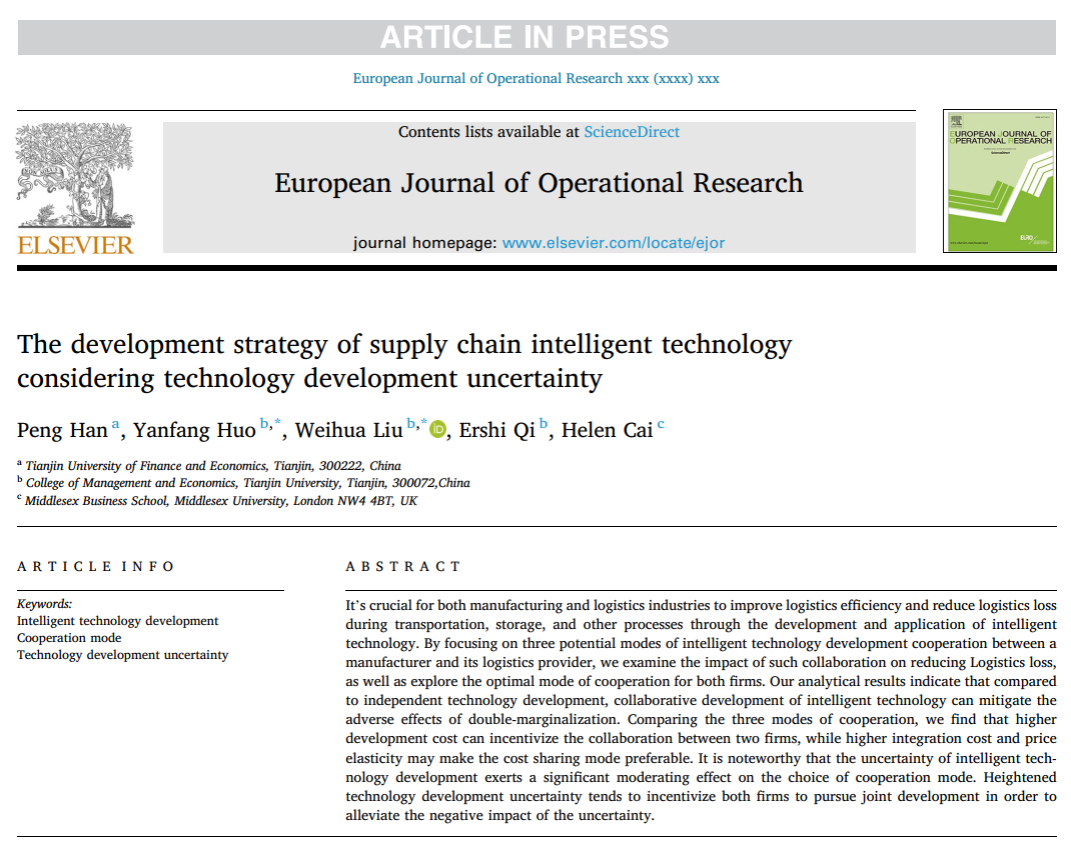 2025年7月,日本AV女优物流与供应链管理系韩鹏博士以第一作者身份与天津大学霍艳芳教授、刘伟华教授、齐二石教授以及英国密德萨斯大学Helen Cai教授合作,在英文ABS四星级期刊European Journal of Operational Research在线发表题为“The development strategy of supply chain intelligent technology considering technology development uncertainty”的学术论文。