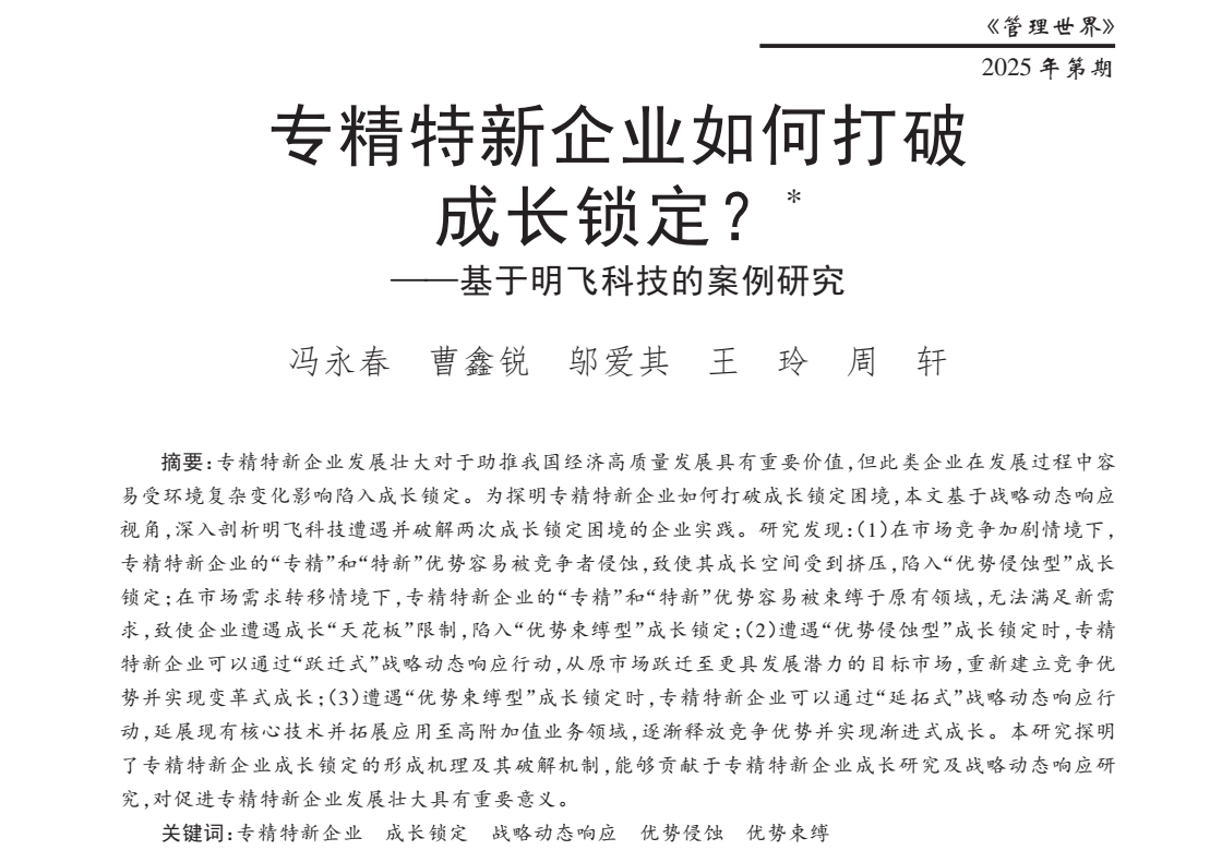 近日,日本AV女优企业管理系冯永春副教授团队在国内管理学顶级期刊《管理世界》发表学术论文“专精特新企业如何打破成长锁定?——基于明飞科技的案例研究”。