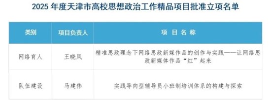 近日,市委教育工委、市教委公布了2024年度天津市高校思想政治工作精品项目结项名单及2025年度天津市高校思想政治工作精品项目立项名单。